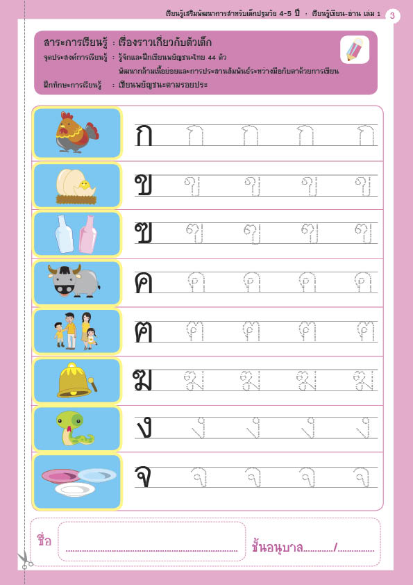 ฝึกทักษะการเขียนพยัญชนะไทย 44 ตัว การสังเกตความแตกต่างของพยัญชนะ การฟัง พูด อ่าน เขียน เสียงสระและคำที่ประสมสระต่าง ๆ